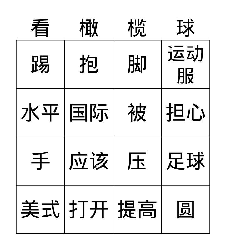 This bingo card has 16 words: 打开, 足球, 脚, 踢, 手, 抱, 压, 提高, 水平, 国际, 美式, 运动服, 应该, 担心, 被 and 圆.