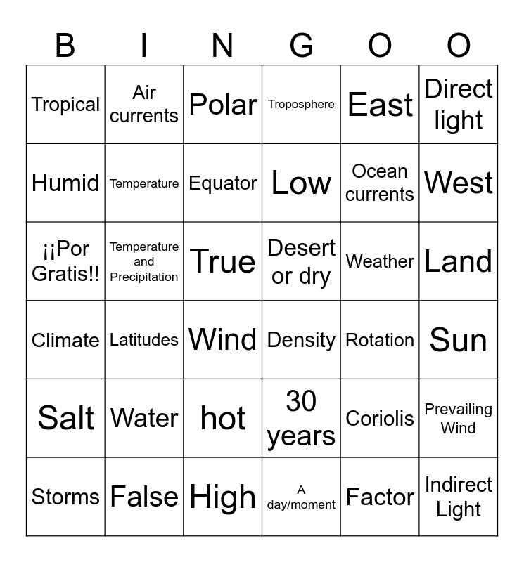 This bingo card has 36 words: 30 years, hot, A day/moment, Humid, Climate, Desert or dry, Temperature, High, East, Coriolis, West, Troposphere, Prevailing Wind, Temperature and Precipitation, Low, Tropical, Salt, Weather, ¡¡Por Gratis!!, Polar, True, Latitudes, Density, Wind, Rotation, Air currents, Ocean currents, False, Equator, Direct light, Indirect Light, Storms, Sun, Land, Water and Factor.