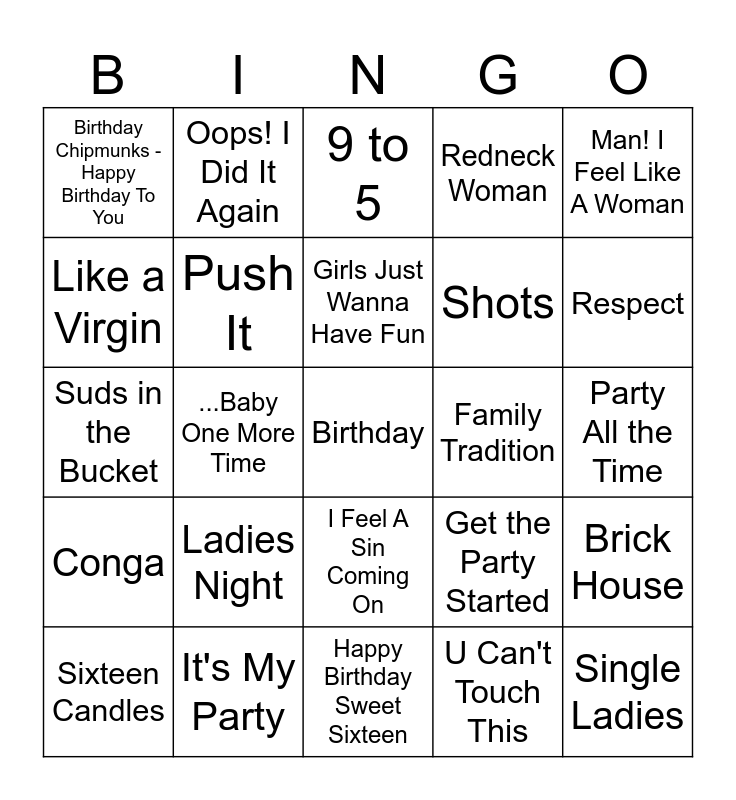 This bingo card has 44 words: Free!, Birthday, In Da Club, Sixteen Candles, Superfreak, U Can't Touch This, 9 to 5, Tipsy, Man! I Feel Like A Woman, It's My Party, Redneck Woman, Family Tradition, I Feel A Sin Coming On, Ladies Night, Celebration, Happy Birthday Sweet Sixteen, Wine Beer Whiskey, Suds in the Bucket, Goodbye Earl, Respect, Oops! I Did It Again, Girls Girls Girls, Fireball, Birthday Chipmunks - Happy Birthday To You, Party In The U.S.A., Party All the Time, Pour Some Sugar On Me, Ice Ice Baby, Get the Party Started, Conga, Here for the Party, Brick House, Let's Get It On, Wannabe, ...Baby One More Time, Play That Funky Music, Dancing Queen, Single Ladies, Girls Just Wanna Have Fun, Like a Virgin, Shots, Rehab, Push It and Wild Thing.