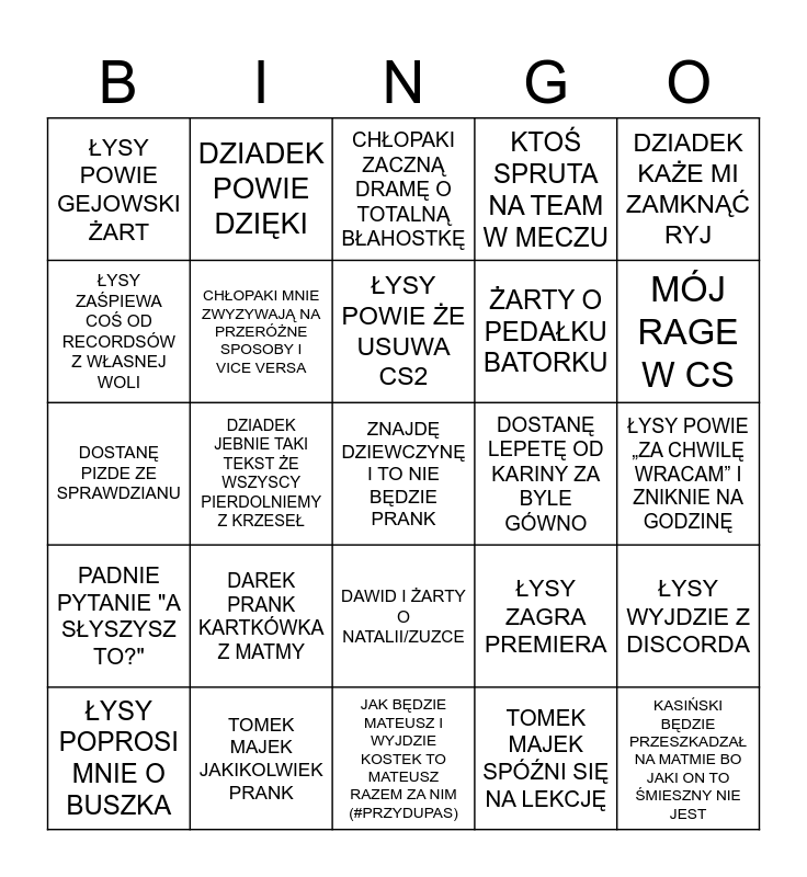 This bingo card has a free space and 24 words: DAREK PRANK KARTKÓWKA Z MATMY, TOMEK MAJEK JAKIKOLWIEK PRANK, ŁYSY POWIE ŻE USUWA CS2, ŁYSY POPROSI MNIE O BUSZKA, DZIADEK KAŻE MI ZAMKNĄĆ RYJ, ŁYSY POWIE GEJOWSKI ŻART, ŁYSY ZAŚPIEWA COŚ OD RECORDSÓW Z WŁASNEJ WOLI, DZIADEK POWIE DZIĘKI, DOSTANĘ LEPETĘ OD KARINY ZA BYLE GÓWNO, DAWID I ŻARTY O NATALII/ZUZCE, ŻARTY O PEDAŁKU BATORKU, DOSTANĘ PIZDE ZE SPRAWDZIANU, ŁYSY ZAGRA PREMIERA, ŁYSY WYJDZIE Z DISCORDA, CHŁOPAKI MNIE ZWYZYWAJĄ NA PRZERÓŻNE SPOSOBY I VICE VERSA, TOMEK MAJEK SPÓŹNI SIĘ NA LEKCJĘ, ŁYSY POWIE „ZA CHWILĘ WRACAM” I ZNIKNIE NA GODZINĘ, CHŁOPAKI ZACZNĄ DRAMĘ O TOTALNĄ BŁAHOSTKĘ, MÓJ RAGE W CS, DZIADEK JEBNIE TAKI TEKST ŻE WSZYSCY PIERDOLNIEMY Z KRZESEŁ, KASIŃSKI BĘDZIE PRZESZKADZAŁ NA MATMIE BO JAKI ON TO ŚMIESZNY NIE JEST, PADNIE PYTANIE "A SŁYSZYSZ TO?", KTOŚ SPRUTA NA TEAM W MECZU and JAK BĘDZIE MATEUSZ I WYJDZIE KOSTEK TO MATEUSZ RAZEM ZA NIM (#PRZYDUPAS).