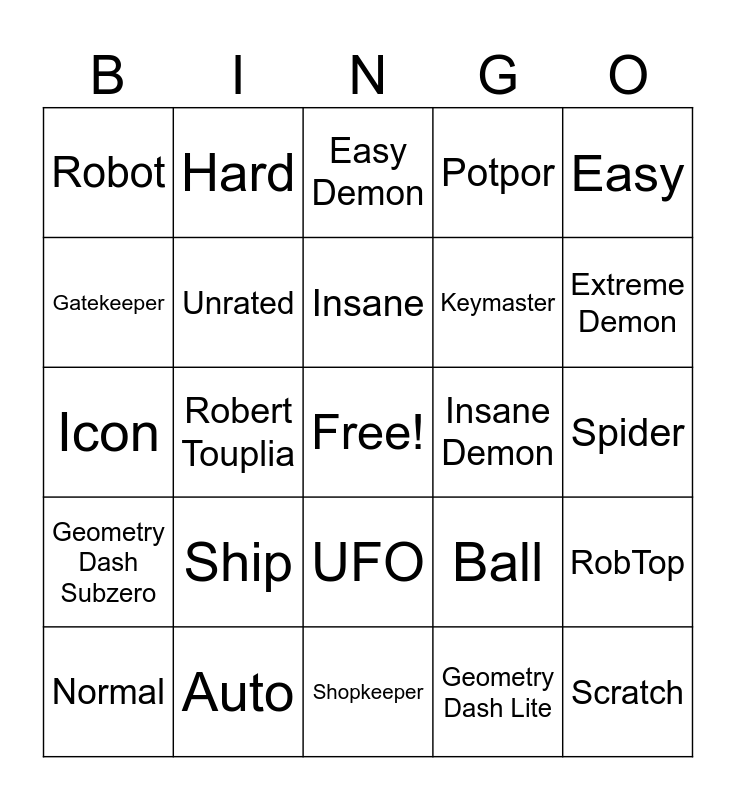 This bingo card has a free space and 34 words: Geometry Dash, Geometry Dash Lite, Geometry Dash Meltdown, Geometry Dash World, Geometry Dash Subzero, Unrated, Easy, Normal, Hard, Harder, Insane, Easy Demon, Meidiem Demon, Hard Demon, Insane Demon, Extreme Demon, Auto, Icon, Ship, Ball, UFO, Wave, Robot, Spider, Shopkeeper, Scratch, Potpor, Vaultkeeper, Keymaster, Gatekeeper, Demon Guardian, Robert Touplia, RobTop and RibRub.
