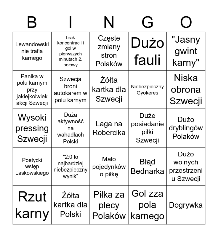 This bingo card has a free space and 24 words: "2:0 to najbardziej niebezpieczny wynik", Żółta kartka dla Polski, Żółta kartka dla Szwecji, Rzut karny, "Jasny gwint karny", Lewandowski nie trafia karnego, Panika w polu karnym przy jakiejkolwiek akcji Szwecji, brak koncentracji i gol w pierwszych minutach 2. połowy, Duże posiadanie piłki Szwecji, Mało pojedynków o piłkę, Niebezpieczny Gyokeres, Wysoki pressing Szwecji, Błąd Bednarka, Dużo wolnych przestrzeni u Szwecji, Szwecja broni autokarem w polu karnym, Gol zza pola karnego, Dużo dryblingów Polaków, Częste zmiany stron Polaków, Niska obrona Szwecji, Duża aktywność na wahadłach Polski, Dogrywka, Poetycki wstęp Laskowskiego, Dużo fauli and Piłka za plecy Polaków.