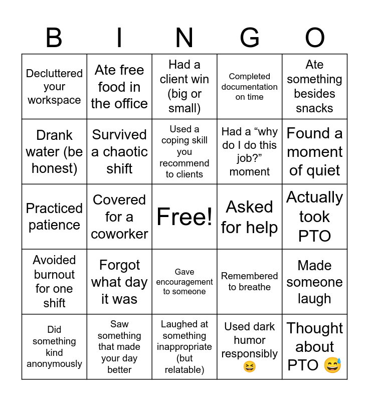 This bingo card has a free space and 37 words: Drank coffee while it was still hot, Helped a coworker, Took a real lunch break, Survived a chaotic shift, Made someone laugh, Forgot what day it was, Used a coping skill you recommend to clients, Got fresh air during your shift, Ate something besides snacks, Said “just one more thing”, Covered for a coworker, Completed documentation on time, Thought about PTO 😅, Actually took PTO, Drank water (be honest), Avoided burnout for one shift, Got called for something unexpected, Had a client win (big or small), Gave encouragement to someone, Asked for help, Decluttered your workspace, Found a moment of quiet, Did something kind anonymously, Laughed at something inappropriate (but relatable), Felt appreciated (even briefly), Used dark humor responsibly 😆, Ate free food in the office, Said “I’ll circle back”, Supported a teammate, Ended your shift on time, Stayed late (because…of course), Saw something that made your day better, Practiced patience, Helped de-escalate a situation, Remembered to breathe, Had a “why do I do this job?” moment and Had a “this is why I do this job” moment.