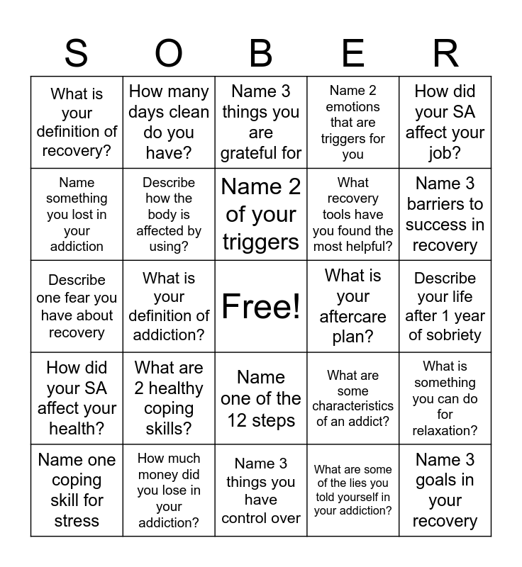 This bingo card has a free space and 24 words: What are 2 healthy coping skills?, How much money did you lose in your addiction?, Name 2 of your triggers, Name one coping skill for stress, How did your SA affect your job?, What is your definition of recovery?, Name something you lost in your addiction, How many days clean do you have?, What is your aftercare plan?, Name one of the 12 steps, What recovery tools have you found the most helpful?, Describe one fear you have about recovery, What are some characteristics of an addict?, What is something you can do for relaxation?, Describe how the body is affected by using?, What are some of the lies you told yourself in your addiction?, Describe your life after 1 year of sobriety, Name 3 things you are grateful for, Name 3 barriers to success in recovery, What is your definition of addiction?, Name 3 goals in your recovery, How did your SA affect your health?, Name 2 emotions that are triggers for you and Name 3 things you have control over.