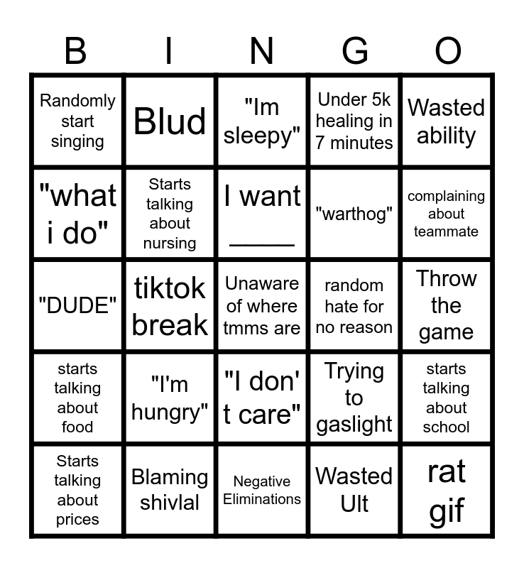 This bingo card has a free space and 24 words: "I'm hungry", Blaming shivlal, I want ____, Starts talking about prices, Wasted ability, Randomly start singing, "what i do", Blud, random hate for no reason, "I don' t care", "warthog", "DUDE", Trying to gaslight, starts talking about school, Starts talking about nursing, Wasted Ult, Throw the game, "Im sleepy", complaining about teammate, tiktok break, rat gif, starts talking about food, Under 5k healing in 7 minutes and Negative Eliminations.