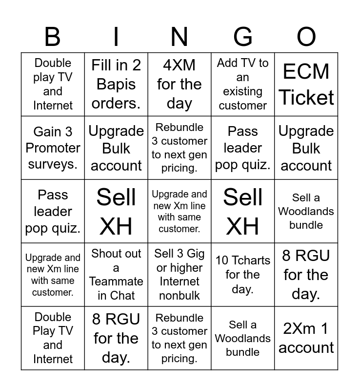 This bingo card has a free space and 43 words: 2xm 1 account, 2Xm 1 account, Double play TV and Internet, Double Play TV and Internet, Sell a Woodlands bundle, Sell a Woodlands bundle, 4XM for the day, 10 Tcharts for the day., ECM Ticket, 8 RGU for the day., Add TV to an existing customer, Sell XH, Sell 3 Gig or higher Internet nonbulk, Shout out a Teammate in Chat, Add mobile to a Bapis pickup., Rebundle 3 customer to next gen pricing., Gain 3 Promoter surveys., Pass leader pop quiz., Upgrade Bulk account, Upgrade Bulk account, Fill in 2 Bapis orders., 2xm 1 account, 2Xm 1 account, Double play TV and Internet, Double Play TV and Internet, Sell a Woodlands bundle, Sell a Woodlands bundle, 4XM for the day, 10 Tcharts for the day., Upgrade and new Xm line with same customer., ECM Ticket, 8 RGU for the day., Add TV to an existing customer, Sell XH, Sell 3 Gig or higher Internet nonbulk, Shout out a Teammate in Chat, Add mobile to a Bapis pickup., Rebundle 3 customer to next gen pricing., Gain 3 Promoter surveys., Pass leader pop quiz., Upgrade Bulk account, Upgrade Bulk account and Fill in 2 Bapis orders..