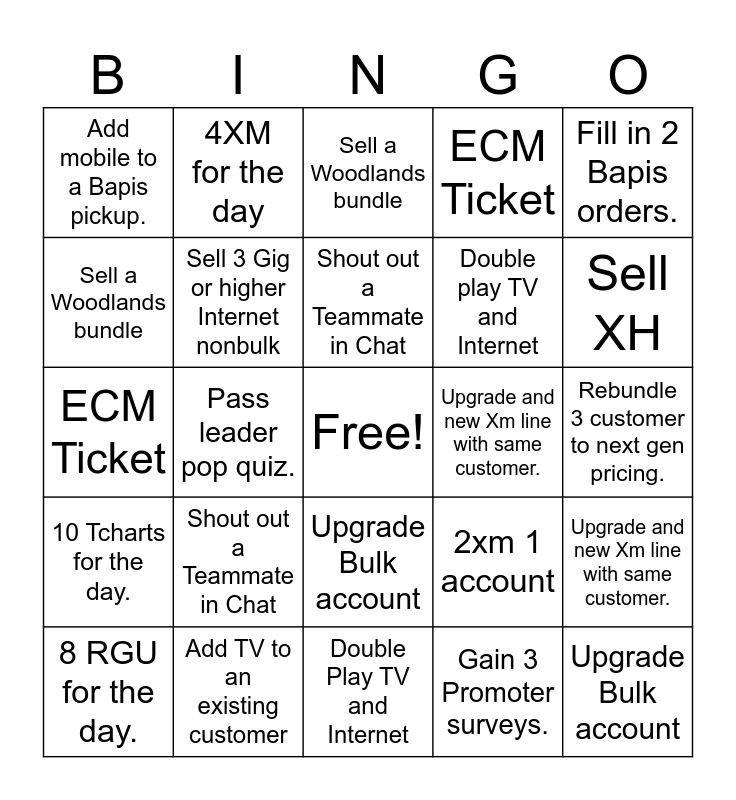 This bingo card has a free space and 27 words: 2xm 1 account, 2Xm 1 account, Double play TV and Internet, Double Play TV and Internet, Sell a Woodlands bundle, Sell a Woodlands bundle, 4XM for the day, 10 Tcharts for the day., Upgrade and new Xm line with same customer., Upgrade and new Xm line with same customer., ECM Ticket, ECM Ticket, 8 RGU for the day., Add TV to an existing customer, Sell XH, Sell XH, Sell 3 Gig or higher Internet nonbulk, Shout out a Teammate in Chat, Shout out a Teammate in Chat, Add mobile to a Bapis pickup., Rebundle 3 customer to next gen pricing., Gain 3 Promoter surveys., Pass leader pop quiz., Upgrade Bulk account, Upgrade Bulk account, Fill in 2 Bapis orders. and Pass leader pop quiz..