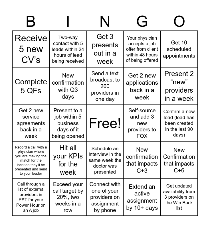 This bingo card has a free space and 24 words: Hit all your KPIs for the week, Exceed your call target by 20%, two weeks in a row, Send a text broadcast to 200 providers in one day, Call through a list of external providers in PST for your Power Hour on an A job, Get 10 scheduled appointments, Receive 5 new CV’s, Complete 5 QFs, Two-way contact with 5 leads within 24 hours of lead being received, Self-source and add 3 new providers to FOX, Schedule an interview in the same week the doctor was presented, Get 2 new applications back in a week, Get 2 new service agreements back in a week, New confirmation that impacts C+3, New Confirmation that impacts C+6, New confirmation with Q3 days, Extend an active assignment by 10+ days, Confirm a new lead (lead has been created in the last 90 days), Get 3 presents out in a week, Present 2 “new” providers in a week, Present to a job within 5 business days of it being opened, Get updated availability from 3 providers on the Win Back list, Record a call with a physician where you are making the match for the location they’ll be presented and send to your leader, Your physician accepts a job offer from client within 48 hours of being offered and Connect with one of your providers on assignment by phone.