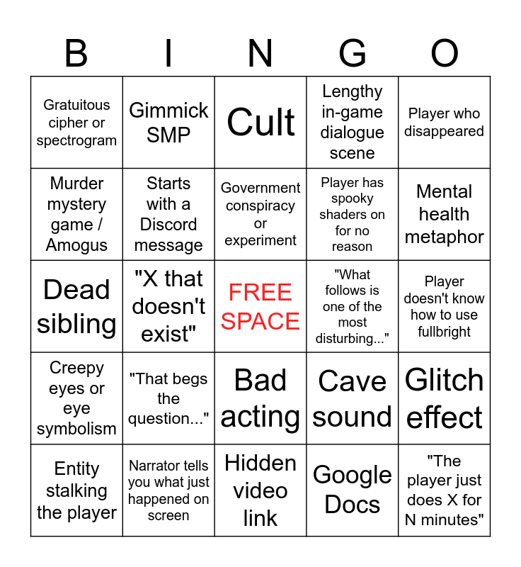 This bingo card has a free space and 24 words: "That begs the question...", Narrator tells you what just happened on screen, Government conspiracy or experiment, Entity stalking the player, Player who disappeared, Gratuitous cipher or spectrogram, Murder mystery game / Amogus, Gimmick SMP, "What follows is one of the most disturbing...", Bad acting, Player has spooky shaders on for no reason, Dead sibling, Cave sound, Glitch effect, Starts with a Discord message, Google Docs, Player doesn't know how to use fullbright, Cult, Mental health metaphor, "X that doesn't exist", "The player just does X for N minutes", Creepy eyes or eye symbolism, Lengthy in-game dialogue scene and Hidden video link.