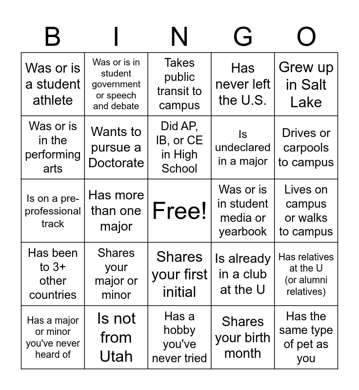 This bingo card has a free space and 24 words: Shares your major or minor, Is not from Utah, Did AP, IB, or CE in High School, Has a major or minor you've never heard of, Grew up in Salt Lake, Was or is a student athlete, Was or is in the performing arts, Was or is in student government or speech and debate, Was or is in student media or yearbook, Shares your first initial, Is undeclared in a major, Is on a pre-professional track, Is already in a club at the U, Has relatives at the U (or alumni relatives), Wants to pursue a Doctorate, Shares your birth month, Lives on campus or walks to campus, Takes public transit to campus, Drives or carpools to campus, Has more than one major, Has the same type of pet as you, Has been to 3+ other countries, Has never left the U.S. and Has a hobby you've never tried.