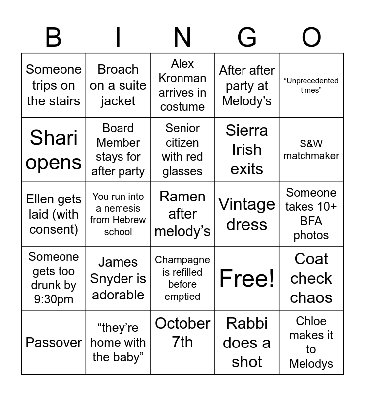 This bingo card has 25 words: James Snyder is adorable, October 7th, Senior citizen with red glasses, Passover, “Unprecedented times”, Someone trips on the stairs, Shari opens, Broach on a suite jacket, Vintage dress, Champagne is refilled before emptied, Sierra Irish exits, Ellen gets laid (with consent), Free!, Coat check chaos, Board Member stays for after party, Chloe makes it to Melodys, Someone takes 10+ BFA photos, Alex Kronman arrives in costume, S&W matchmaker, You run into a nemesis from Hebrew school, Ramen after melody’s, “they’re home with the baby”, Someone gets too drunk by 9:30pm, After after party at Melody’s and Rabbi does a shot.