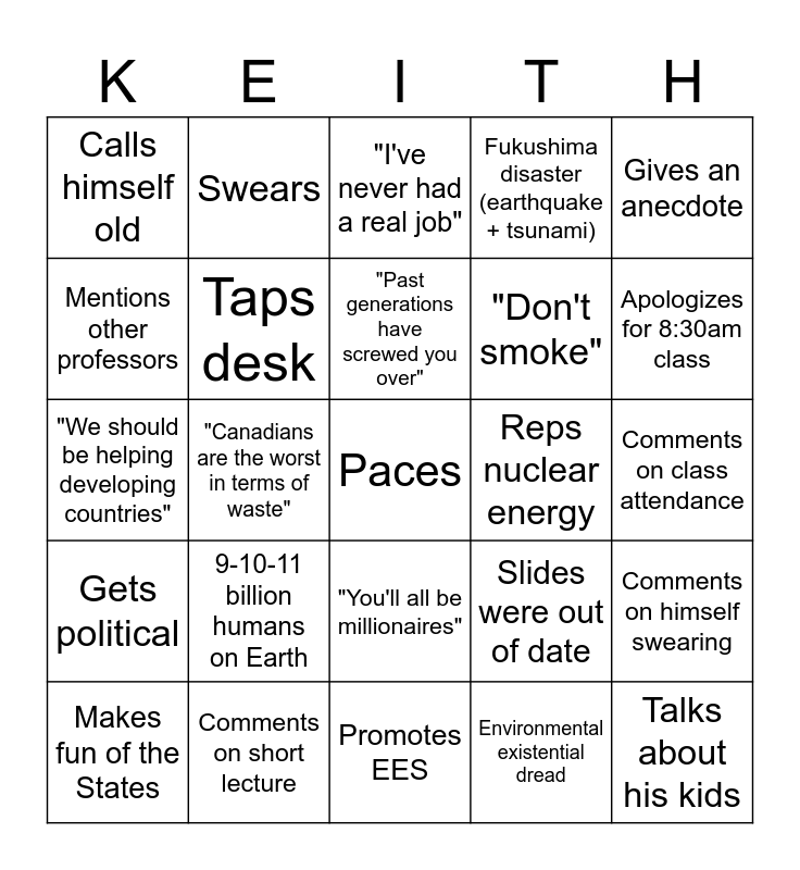 This bingo card has a free space and 24 words: 9-10-11 billion humans on Earth, Comments on short lecture, "Past generations have screwed you over", Makes fun of the States, Gives an anecdote, Calls himself old, Mentions other professors, Swears, Reps nuclear energy, "You'll all be millionaires", "Don't smoke", "We should be helping developing countries", Slides were out of date, Comments on himself swearing, Taps desk, Environmental existential dread, Comments on class attendance, "I've never had a real job", Apologizes for 8:30am class, "Canadians are the worst in terms of waste", Talks about his kids, Gets political, Fukushima disaster (earthquake + tsunami) and Promotes EES.