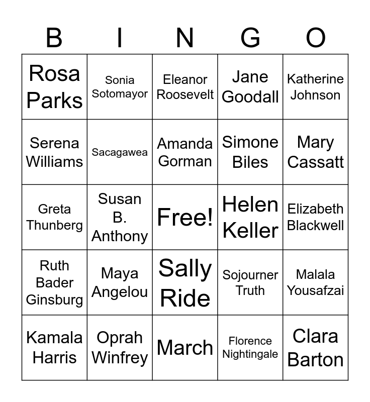 This bingo card has a free space and 31 words: March, Harriet Tubman, Susan B. Anthony, Amelia Earhart, Rosa Parks, Eleanor Roosevelt, Sacagawea, Sojourner Truth, Helen Keller, Florence Nightingale, Elizabeth Blackwell, Clara Barton, Marie Curie, Abigail Adams, Mary Cassatt, Bessie Coleman, Malala Yousafzai, Maya Angelou, Ruth Bader Ginsburg, Sally Ride, Katherine Johnson, Michelle Obama, Kamala Harris, Sonia Sotomayor, Simone Biles, Serena Williams, Jane Goodall, Greta Thunberg, Oprah Winfrey, Amanda Gorman and Misty Copeland.
