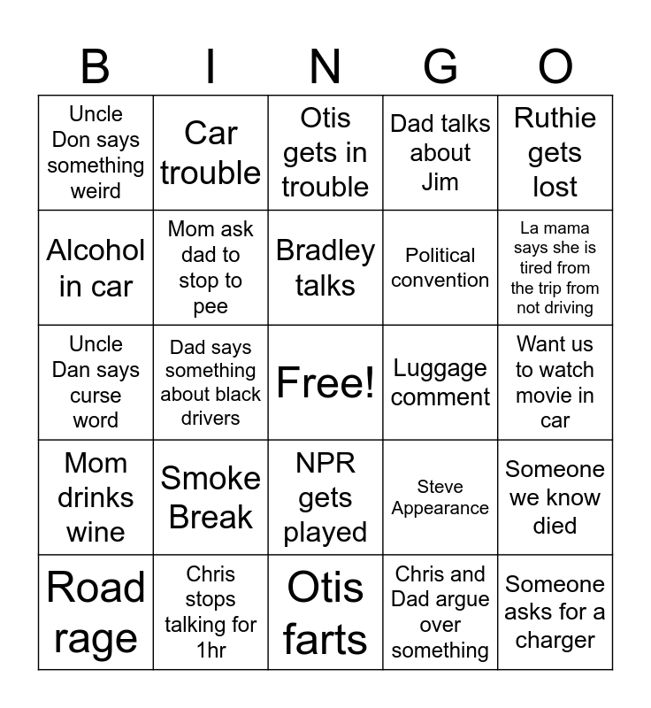 This bingo card has a free space and 24 words: Smoke Break, Chris stops talking for 1hr, Bradley talks, Road rage, Ruthie gets lost, Uncle Don says something weird, Alcohol in car, Car trouble, Luggage comment, NPR gets played, Political convention, Uncle Dan says curse word, Steve Appearance, Someone we know died, Mom ask dad to stop to pee, Chris and Dad argue over something, Want us to watch movie in car, Otis gets in trouble, La mama says she is tired from the trip from not driving, Dad says something about black drivers, Someone asks for a charger, Mom drinks wine, Dad talks about Jim and Otis farts.