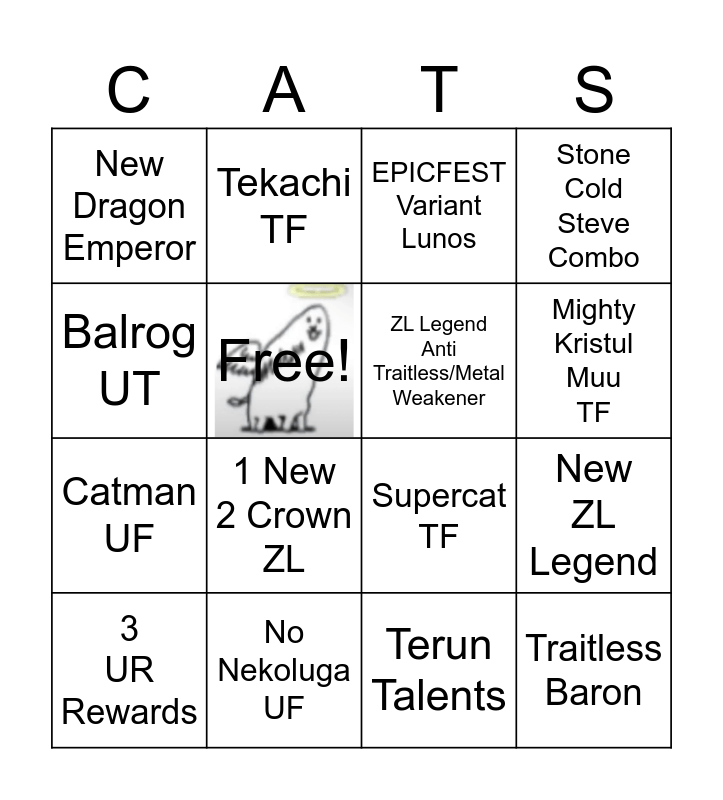 This bingo card has 1 images and 16 words: No Nekoluga UF, New ZL Legend, EPICFEST Variant Lunos, New Dragon Emperor, Catman UF, Tekachi TF, Supercat TF, Terun Talents, Balrog UT, Free!, 3 UR Rewards, Stone Cold Steve Combo, 1 New 2 Crown ZL, Mighty Kristul Muu TF, ZL Legend Anti Traitless/Metal Weakener and Traitless Baron.