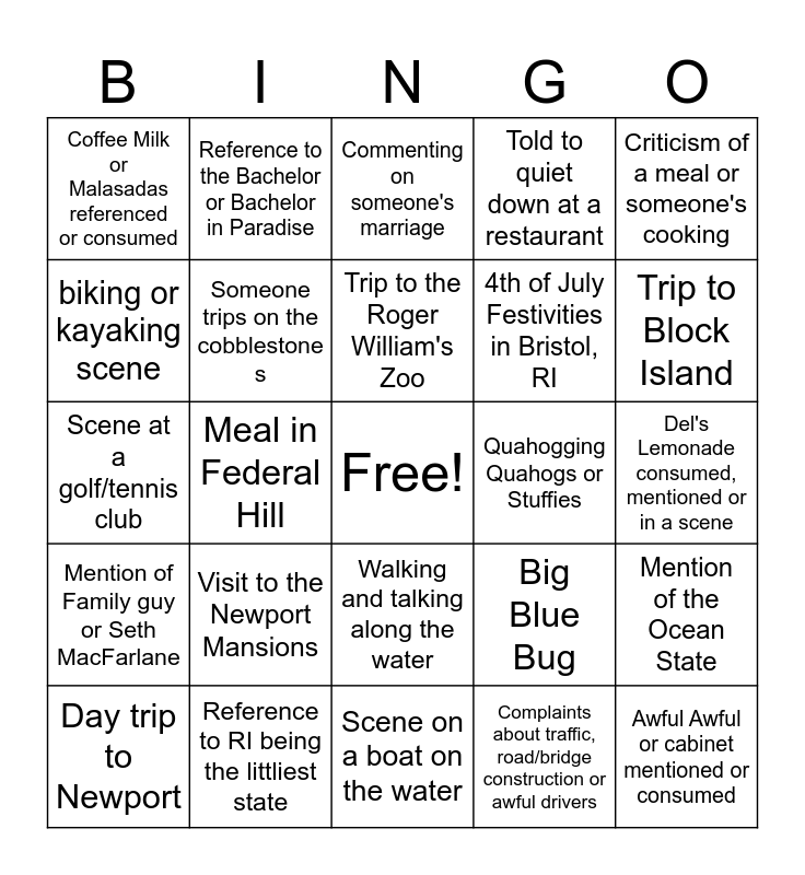 This bingo card has a free space and 29 words: Day trip to Newport, Waterfire Festival, Meal in Federal Hill, Arguement at the Beach, Coffee Milk or Malasadas referenced or consumed, Commenting on someone's marriage, Someone trips on the cobblestone s, Visit to the Newport Mansions, Quahogging Quahogs or Stuffies, Reference to RI being the littliest state, Del's Lemonade consumed, mentioned or in a scene, Awful Awful or cabinet mentioned or consumed, Scene on a boat on the water, Complaints about traffic, road/bridge construction or awful drivers, Trip to Block Island, Brown University, Walking and talking along the water, Mention of Family guy or Seth MacFarlane, Criticism of a meal or someone's cooking, Scene at a golf/tennis club, Big Blue Bug, Day trip or event in Boston, 4th of July Festivities in Bristol, RI, biking or kayaking scene, Told to quiet down at a restaurant, Reference to the Bachelor or Bachelor in Paradise, Mention of the Ocean State, Trip to the Roger William's Zoo and Trip to an Art Museum.
