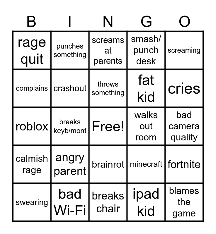 This bingo card has a free space and 24 words: angry parent, bad Wi-Fi, throws something, swearing, screaming, rage quit, complains, punches something, walks out room, brainrot, fat kid, roblox, minecraft, fortnite, crashout, ipad kid, bad camera quality, screams at parents, cries, breaks keyb/mont, blames the game, calmish rage, smash/ punch desk and breaks chair.