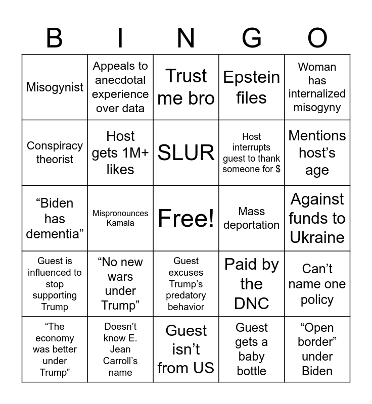 This bingo card has a free space and 42 words: MAGA mobile, SLUR, Guest runs, “No new wars under Trump”, Guest gets a baby bottle, Can’t name one policy, “Open border” under Biden, Gas/Grocery prices, Trust me bro, Guest excuses Trump’s predatory behavior, Against funds to Ukraine, Mentions host’s age, Mispronounces Kamala, Woman has internalized misogyny, “But was he (Trump) held criminally responsible?” (E. Jean Carroll Case), Paid by the DNC, Continuously mentions Joe Biden, “Biden has dementia”, Guest gets kicked (violation), Appeals to anecdotal experience over data, Conspiracy theorist, Host glitches, FAKE NEWS, Misogynist, Pivot, Host covers mouth in shock, Host interrupts guest to thank someone for $, Host does a funny voice, No facts. All feelings., Mention of a “real job”, “How many branches of government are there?”, Guest is influenced to stop supporting Trump, Host gets 1M+ likes, Guest isn’t from US, Guest is a fetus, “The economy was better under Trump”, Doesn’t know E. Jean Carroll’s name, Mass deportation, War in Iran, Supports tariffs, Epstein files and Guest brings up deportations under Obama.