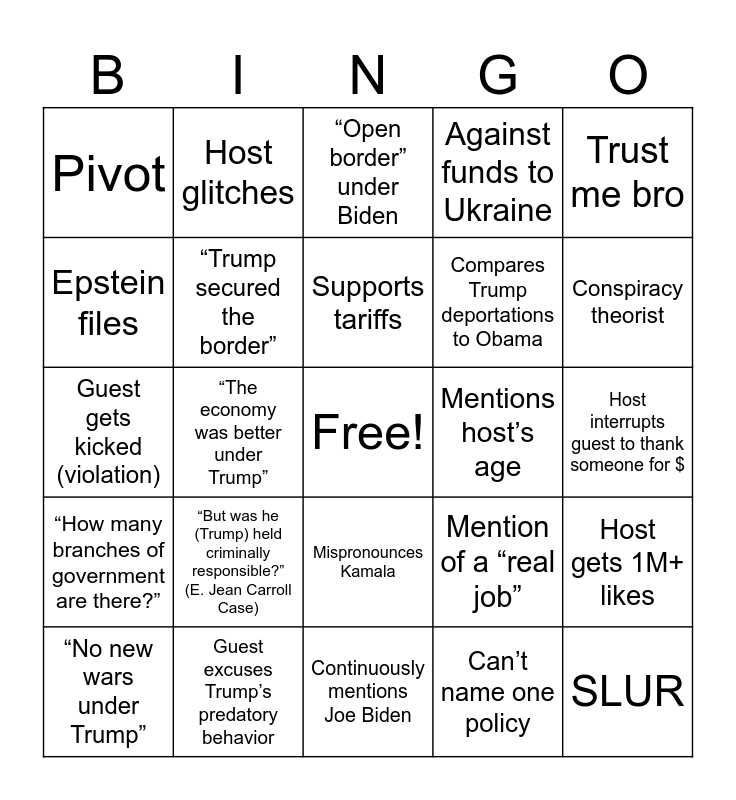 This bingo card has a free space and 44 words: MAGA mobile, SLUR, Guest runs, “No new wars under Trump”, Guest gets a baby bottle, Can’t name one policy, “Open border” under Biden, Gas prices, Trust me bro, Guest excuses Trump’s predatory behavior, Against funds to Ukraine, Mentions host’s age, Mispronounces Kamala, “But was he (Trump) held criminally responsible?” (E. Jean Carroll Case), Paid by the DNC, Continuously mentions Joe Biden, “Biden has dementia”, Guest gets kicked (violation), Appeals to anecdotal experience over data, Conspiracy theorist, Host glitches, FAKE NEWS, Misogynist, Pivot, Host covers mouth in shock, Host interrupts guest to thank someone for $, Host does a funny voice, No facts. All feelings., Mention of a “real job”, “How many branches of government are there?”, Guest is influenced to stop supporting Trump, Host gets 1M+ likes, Guest isn’t from US, Guest is a fetus, “The economy was better under Trump”, Doesn’t know E. Jean Carroll’s name, Mass deportation, War in Iran, Supports tariffs, Epstein files, Compares Trump deportations to Obama, ICE Shootings, “Trump secured the border” and Charlie Kirk is mentioned.