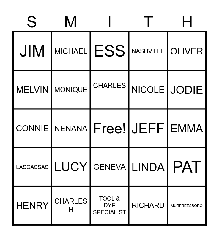 This bingo card has a free space and 24 words: LUCY, CHARLES H, CHARLES, HENRY, OLIVER, JIM, MELVIN, MICHAEL, JEFF, GENEVA, NICOLE, CONNIE, LINDA, PAT, MONIQUE, RICHARD, EMMA, ESS, JODIE, NENANA, MURFREESBORO, LASCASSAS, NASHVILLE and TOOL & DYE SPECIALIST.