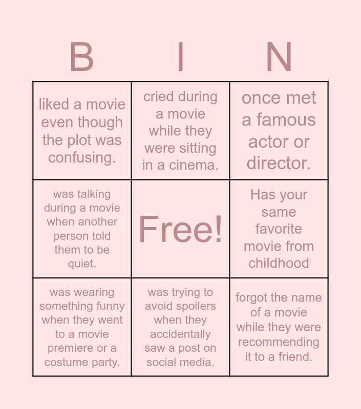 This bingo card has a free space and 8 words: Has your same favorite movie from childhood, once met a famous actor or director., cried during a movie while they were sitting in a cinema., was wearing something funny when they went to a movie premiere or a costume party., liked a movie even though the plot was confusing., forgot the name of a movie while they were recommending it to a friend., was talking during a movie when another person told them to be quiet. and was trying to avoid spoilers when they accidentally saw a post on social media..