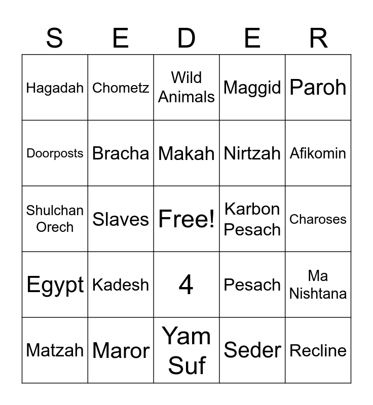 This bingo card has a free space and 24 words: Matzah, Kadesh, Makah, Seder, Paroh, Hagadah, Chometz, Wild Animals, Karbon Pesach, Charoses, Shulchan Orech, Bracha, Pesach, Ma Nishtana, Doorposts, Maror, Yam Suf, Maggid, Afikomin, Egypt, Slaves, 4, Nirtzah and Recline.
