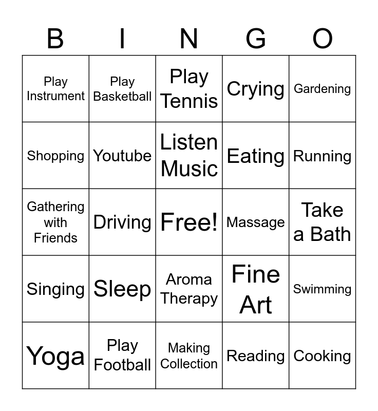 This bingo card has a free space and 24 words: Sleep, Play Football, Listen Music, Yoga, Gardening, Play Instrument, Shopping, Play Basketball, Massage, Aroma Therapy, Eating, Gathering with Friends, Fine Art, Swimming, Youtube, Reading, Take a Bath, Play Tennis, Running, Driving, Cooking, Singing, Crying and Making Collection.