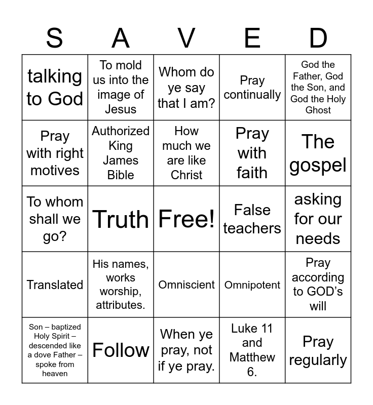 This bingo card has a free space and 33 words: Copy, Read, Truth, Church, Translated, Authorized King James Bible, God the Father, God the Son, and God the Holy Ghost, Son – baptized Holy Spirit – descended like a dove Father – spoke from heaven, To mold us into the image of Jesus, He wants a relationship to us, How much we are like Christ, Whom do ye say that I am?, Deity of Christ, Salvation, False teachers, The gospel, Follow, To whom shall we go?, His names, works worship, attributes., Omnipotent, Omniscient, Omnipresent, talking to God, asking for our needs, When ye pray, not if ye pray., Pray regularly, Pray continually, Pray with faith, Pray with right motives, Pray according to GOD’s will, Pray in Jesus name., Luke 11 and Matthew 6. and praise and thanksgiving.