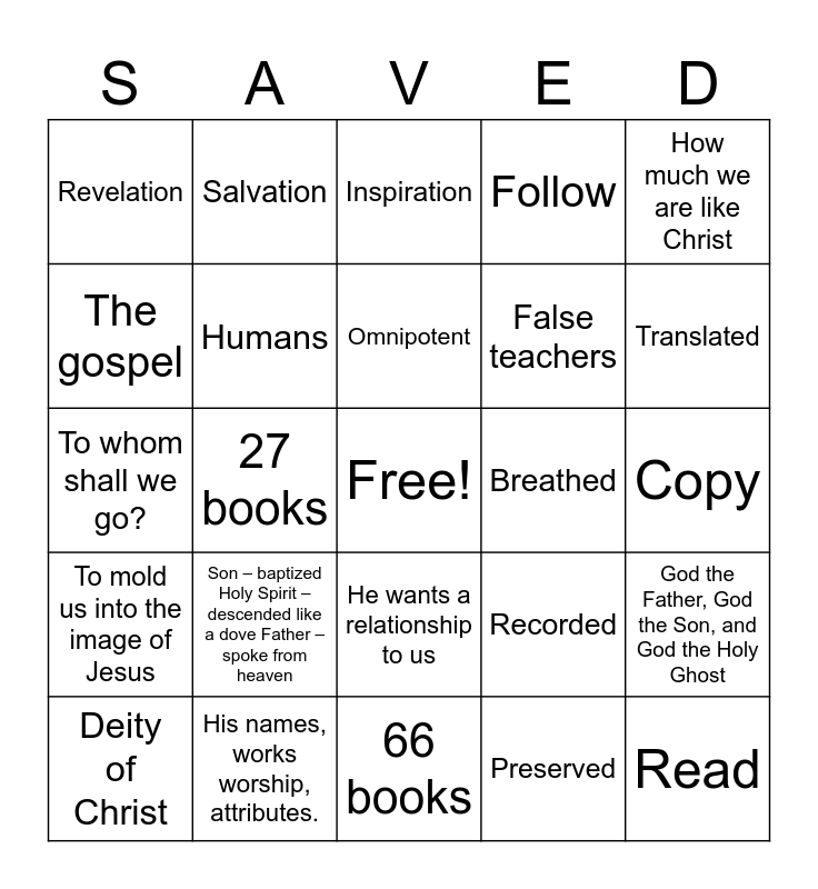 This bingo card has a free space and 31 words: 66 books, 39 books, 27 books, Subjects, Revelation, Inspiration, Humans, Recorded, Breathed, Preserved, Copy, Read, Truth, Church, Translated, Authorized King James Bible, God the Father, God the Son, and God the Holy Ghost, Son – baptized Holy Spirit – descended like a dove Father – spoke from heaven, To mold us into the image of Jesus, He wants a relationship to us, How much we are like Christ, Whom do ye say that I am?, Deity of Christ, Salvation, False teachers, The gospel, Follow, To whom shall we go?, His names, works worship, attributes., Omnipotent and Omniscient.