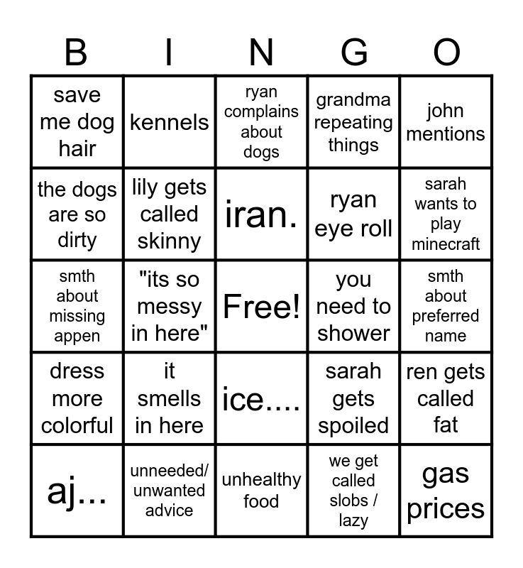 This bingo card has a free space and 24 words: it smells in here, unneeded/ unwanted advice, iran., aj..., john mentions, save me dog hair, the dogs are so dirty, kennels, you need to shower, ice...., ryan eye roll, smth about missing appen, sarah gets spoiled, ren gets called fat, lily gets called skinny, we get called slobs / lazy, smth about preferred name, ryan complains about dogs, sarah wants to play minecraft, "its so messy in here", gas prices, dress more colorful, grandma repeating things and unhealthy food.