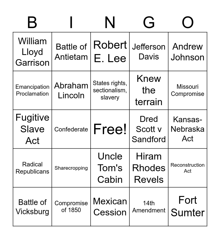 This bingo card has a free space and 34 words: 13th Amendment, 14th Amendment, 15th Amendment, Freedmen's Bureau, Radical Republicans, Abraham Lincoln, Andrew Johnson, Battle of Vicksburg, Battle of Antietam, Battle of Gettysburg, States rights, sectionalism, slavery, Robert E. Lee, Appomattox Courthouse, Ulysses S. Grant, Dred Scott v Sandford, Missouri Compromise, Compromise of 1850, Fugitive Slave Act, Sharecropping, Hiram Rhodes Revels, Uncle Tom's Cabin, Frederick Douglas, William Lloyd Garrison, Kansas-Nebraska Act, Mexican Cession, Fort Sumter, Jefferson Davis, Railroads, bigger population, Knew the terrain, Emancipation Proclamation, Union, Confederate, Reconstruction Act and Poll tax, literacy tests, grandfather clause.