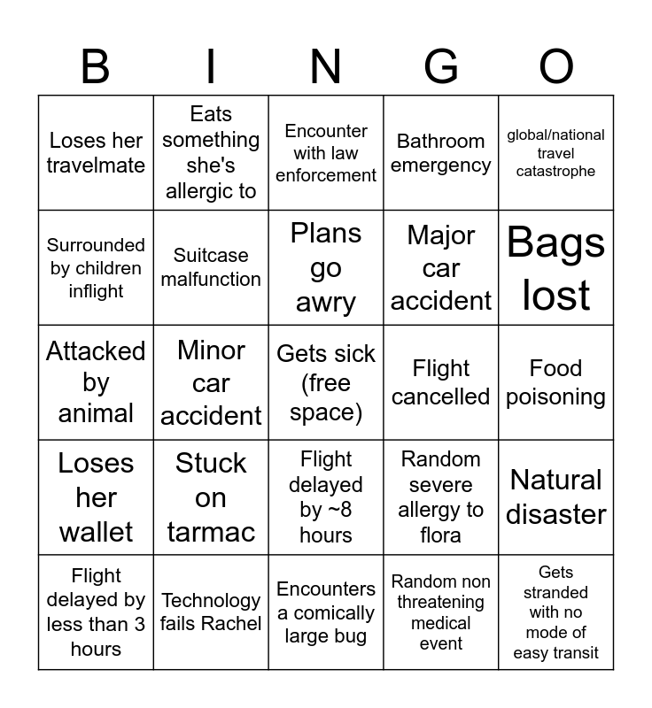 This bingo card has a free space and 29 words: Flight delayed by less than 3 hours, Needs more raw, Minor car accident, Breaks her cell phone, Loses her travelmate, Encounter with law enforcement, Suitcase malfunction, Stuck on tarmac, Flight cancelled, Technology fails Rachel, Food poisoning, Gets stranded with no mode of easy transit, Encounters a comically large bug, Random non threatening medical event, Bags lost, GPS leads astray, Flight delayed by ~8 hours, Loses her wallet, global/national travel catastrophe, Attacked by animal, Random severe allergy to flora, AC/Heating/Water breaks, Major car accident, Surrounded by children inflight, Bathroom emergency, Eats something she's allergic to, Natural disaster, Plans go awry and Shoes may break.
