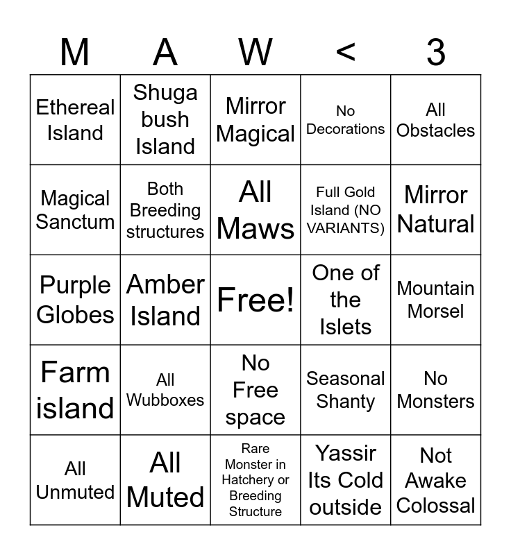 This bingo card has a free space and 24 words: All Wubboxes, All Muted, All Maws, All Unmuted, All Obstacles, Ethereal Island, Magical Sanctum, Shuga bush Island, One of the Islets, No Free space, Full Gold Island (NO VARIANTS), Purple Globes, Seasonal Shanty, No Monsters, Both Breeding structures, Yassir Its Cold outside, Mountain Morsel, Mirror Magical, Mirror Natural, Amber Island, Not Awake Colossal, Farm island, No Decorations and Rare Monster in Hatchery or Breeding Structure.
