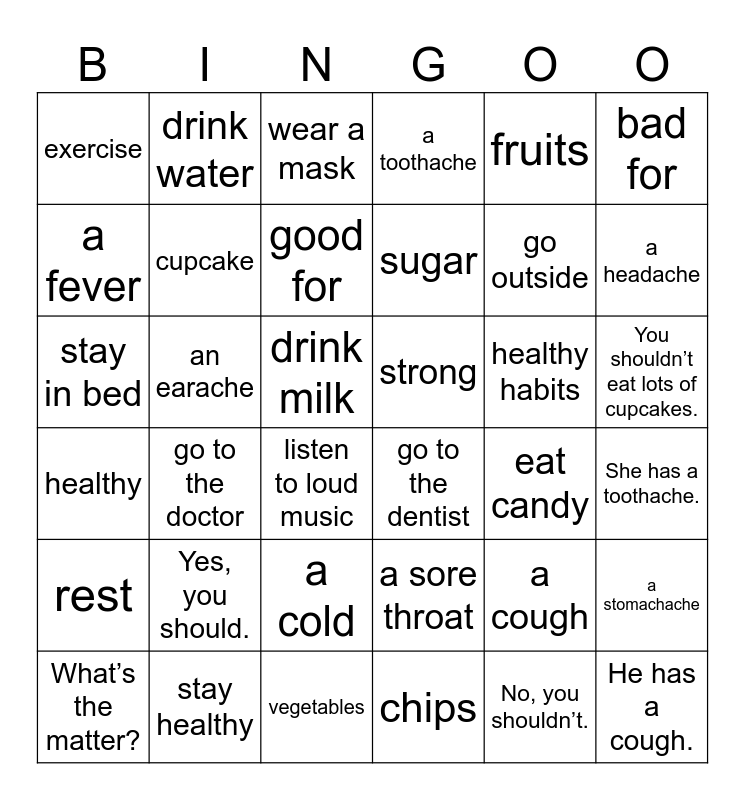 This bingo card has 36 words: a sore throat, a cold, chips, a fever, healthy, strong, cupcake, vegetables, fruits, a cough, a headache, a toothache, a stomachache, an earache, sugar, exercise, rest, healthy habits, stay in bed, wear a mask, drink milk, go to the doctor, go to the dentist, listen to loud music, eat candy, drink water, go outside, stay healthy, good for, bad for, He has a cough., What’s the matter?, She has a toothache., You shouldn’t eat lots of cupcakes., Yes, you should. and No, you shouldn’t..