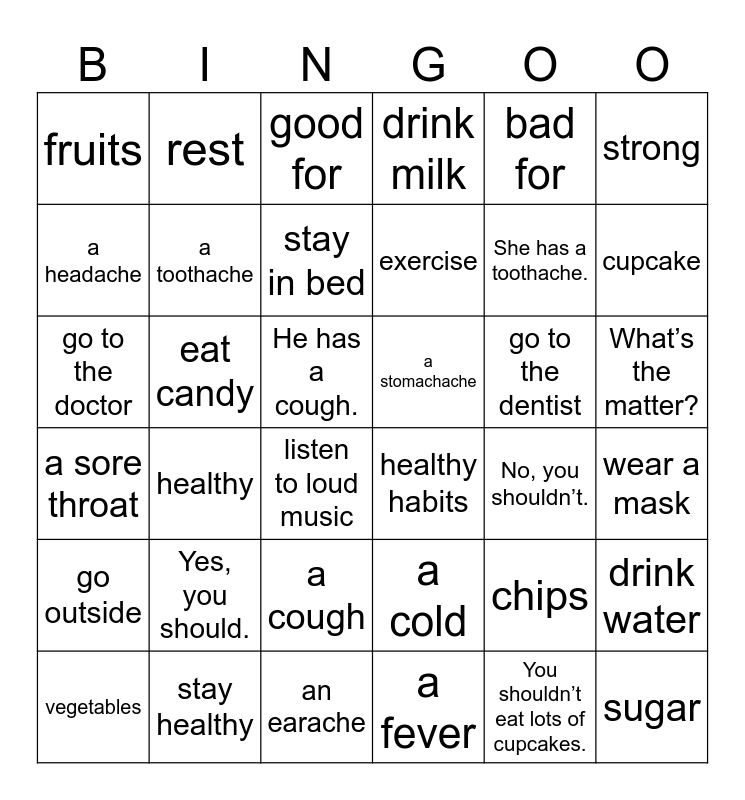 This bingo card has 36 words: a cold, a cough, a fever, a headache, a sore throat, a stomachache, a toothache, an earache, bad for, chips, cupcake, drink milk, drink water, eat candy, exercise, fruits, go outside, go to the dentist, go to the doctor, good for, He has a cough., healthy, healthy habits, listen to loud music, No, you shouldn’t., rest, She has a toothache., stay healthy, stay in bed, strong, sugar, vegetables, wear a mask, What’s the matter?, Yes, you should. and You shouldn’t eat lots of cupcakes..
