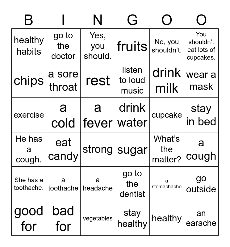 This bingo card has 36 words: go to the dentist, a headache, stay healthy, chips, He has a cough., drink water, a sore throat, vegetables, No, you shouldn’t., a stomachache, wear a mask, fruits, go outside, a cold, listen to loud music, healthy habits, She has a toothache., cupcake, exercise, Yes, you should., a fever, eat candy, sugar, strong, What’s the matter?, go to the doctor, drink milk, bad for, rest, You shouldn’t eat lots of cupcakes., an earache, good for, a cough, stay in bed, a toothache and healthy.