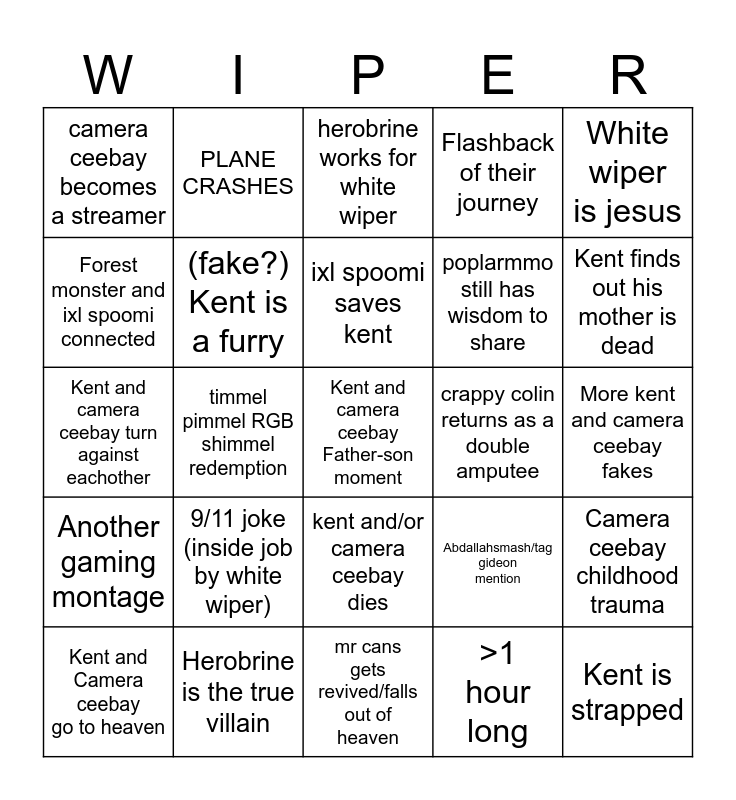 This bingo card has 25 words: 9/11 joke (inside job by white wiper), mr cans gets revived/falls out of heaven, ixl spoomi saves kent, Kent and Camera ceebay go to heaven, White wiper is jesus, camera ceebay becomes a streamer, Forest monster and ixl spoomi connected, PLANE CRASHES, crappy colin returns as a double amputee, kent and/or camera ceebay dies, poplarmmo still has wisdom to share, Kent and camera ceebay turn against eachother, Abdallahsmash/tag gideon mention, Camera ceebay childhood trauma, (fake?) Kent is a furry, Kent is strapped, More kent and camera ceebay fakes, herobrine works for white wiper, Kent finds out his mother is dead, timmel pimmel RGB shimmel redemption, Kent and camera ceebay Father-son moment, Herobrine is the true villain, Another gaming montage, Flashback of their journey and >1 hour long.