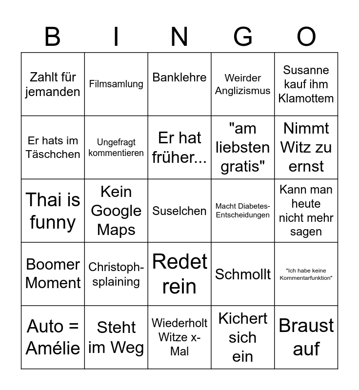 This bingo card has a free space and 24 words: Christoph-splaining, Steht im Weg, Er hat früher..., Auto = Amélie, Susanne kauf ihm Klamottem, Zahlt für jemanden, Er hats im Täschchen, Filmsamlung, Macht Diabetes-Entscheidungen, Redet rein, "am liebsten gratis", Thai is funny, Schmollt, "Ich habe keine Kommentarfunktion", Ungefragt kommentieren, Kichert sich ein, Kann man heute nicht mehr sagen, Banklehre, Nimmt Witz zu ernst, Kein Google Maps, Braust auf, Boomer Moment, Weirder Anglizismus and Wiederholt Witze x-Mal.