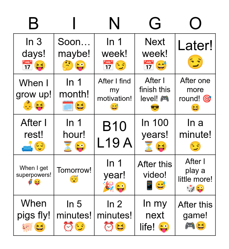 This bingo card has a free space and 30 words: In 5 minutes! โฐ๐, In 10 minutes! โฐ๐, In 1 hour! โณ๐, In 2 hours! โณ๐ , In 3 days! ๐ ๐, In 1 week! ๐ ๐, In 1 month! ๐๏ธ๐, In 1 year! ๐๐, In 100 years! โณ๐, In 2 minutes! โฐ๐, In a minute! ๐, After this game! ๐ฎ๐, In my next life! ๐, When I feel like it! ๐, After one more round! ๐ฏ๐, When Iโm done eating! ๐๐, After this video! ๐ฑ๐ , When I get superpowers! ๐ฆธ๐, Tomorrow! ๐ด, Later! ๐, After I rest! ๐๏ธ๐, When you stop asking! ๐, Soonโฆ maybe! ๐ค๐, After I finish this level! ๐ฎ๐, When I grow up! ๐ถ๐, Next week! ๐ ๐ , After I play a little more! ๐ฒ๐, When pigs fly! ๐๐, After I find my motivation! ๐ and When Iโm famous! ๐๐.