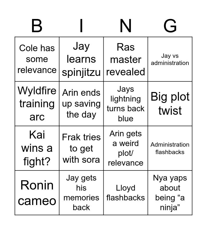 This bingo card has 16 words: Jay gets his memories back, Administration flashbacks, Ras master revealed, Cole has some relevance, Kai wins a fight?, Jay learns spinjitzu, Arin gets a weird plot/ relevance, Lloyd flashbacks, Wyldfire training arc, Arin ends up saving the day, Ronin cameo, Jay vs administration, Frak tries to get with sora, Big plot twist, Jays lightning turns back blue and Nya yaps about being “a ninja”.