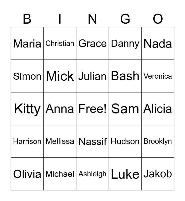 This bingo card has a free space and 24 words: Mellissa, Michael, Julian, Olivia, Nada, Maria, Simon, Christian, Sam, Nassif, Bash, Kitty, Hudson, Brooklyn, Mick, Luke, Alicia, Grace, Veronica, Anna, Jakob, Harrison, Danny and Ashleigh.