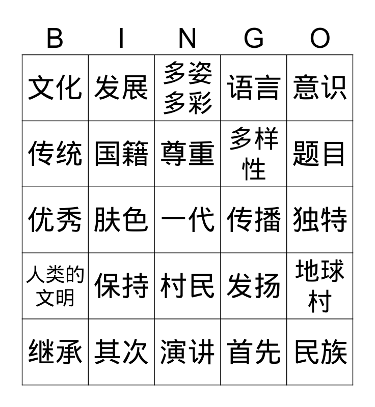 This bingo card has a free space and 24 words: 保持, 其次, 尊重, 继承, 意识, 文化, 传统, 发展, 传播, 村民, 多样性, 优秀, 发扬, 地球村, 国籍, 首先, 独特, 多姿多彩, 题目, 肤色, 民族, 人类的文明, 语言 and 演讲.