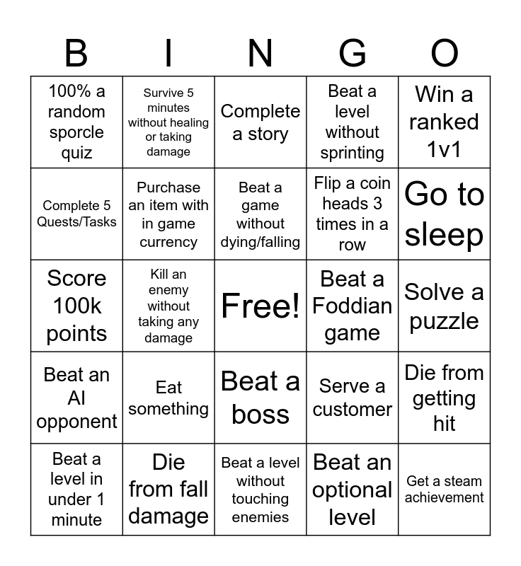 This bingo card has a free space and 24 words: Eat something, Die from fall damage, Beat a game without dying/falling, Beat a level in under 1 minute, Win a ranked 1v1, 100% a random sporcle quiz, Complete 5 Quests/Tasks, Survive 5 minutes without healing or taking damage, Beat a Foddian game, Beat a boss, Flip a coin heads 3 times in a row, Score 100k points, Serve a customer, Die from getting hit, Purchase an item with in game currency, Beat an optional level, Solve a puzzle, Complete a story, Go to sleep, Kill an enemy without taking any damage, Get a steam achievement, Beat an AI opponent, Beat a level without sprinting and Beat a level without touching enemies.