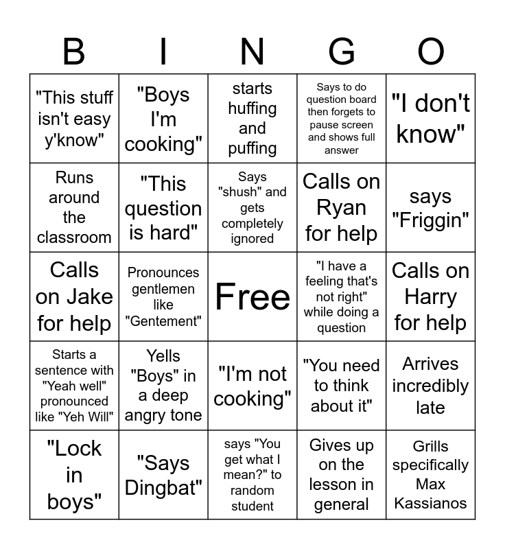 This bingo card has a free space and 24 words: "Lock in boys", Yells "Boys" in a deep angry tone, Says "shush" and gets completely ignored, Gives up on the lesson in general, "I don't know", "This stuff isn't easy y'know", "Boys I'm cooking", starts huffing and puffing, "I have a feeling that's not right" while doing a question, Calls on Harry for help, Calls on Jake for help, "This question is hard", "You need to think about it", Arrives incredibly late, Runs around the classroom, "Says Dingbat", says "You get what I mean?" to random student, Says to do question board then forgets to pause screen and shows full answer, says "Friggin", Starts a sentence with "Yeah well" pronounced like "Yeh Will", Pronounces gentlemen like "Gentement", "I'm not cooking", Calls on Ryan for help and Grills specifically Max Kassianos.