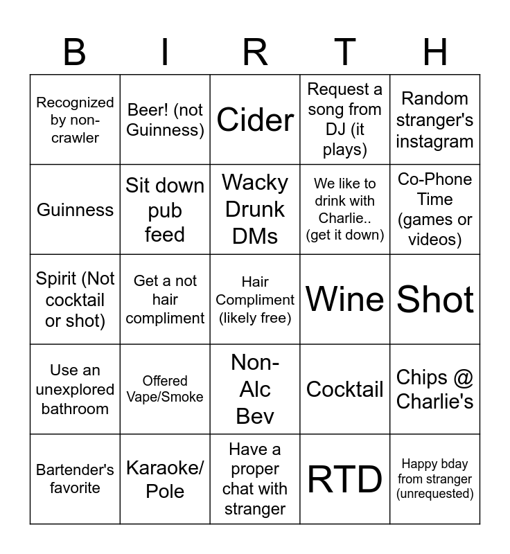 This bingo card has a free space and 24 words: Offered Vape/Smoke, Karaoke/ Pole, Wacky Drunk DMs, Bartender's favorite, Random stranger's instagram, Recognized by non-crawler, Guinness, Beer! (not Guinness), Wine, Non-Alc Bev, We like to drink with Charlie.. (get it down), Spirit (Not cocktail or shot), Cocktail, Chips @ Charlie's, Sit down pub feed, RTD, Shot, Cider, Co-Phone Time (games or videos), Get a not hair compliment, Happy bday from stranger (unrequested), Use an unexplored bathroom, Request a song from DJ (it plays) and Have a proper chat with stranger.