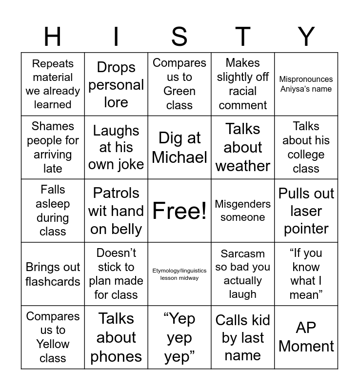 This bingo card has a free space and 60 words: “Talk to the class, not me”, Talks about phones, Talks about building, Brings out flashcards, Calls kid by last name, Mentions importance of last names, Laughs at his own joke, “Good job”/“Thank you”, Talks about weather, Mentions his family, Makes slightly off racial comment, Objectifies women, Shames people for arriving late, Shameless printing error, Realizes he doesn’t like his slides (“I don’t know why this is here”, Repeats material we already learned, AP Moment, Mispronounces Aniysa’s name, Wears wacky outfit, Dig at Michael, Misgenders someone, Compares us to Green class, Compares us to Yellow class, “If you know what I mean”, Tells us to quiet down, Perfect attendance, Dig at Shaan, Indecipherable sound, Talks about his college class, Tech issues, Ms. Brinley walks in, Puts naked people on the board, Cold calls a student he forgot existed, Mentions our stock, Drops personal lore, Illegible map projected on board, Applause on slide show, Patrols wit hand on belly, Plays classical music during work time, Falls asleep during class, Voice randomly changes, Doesn’t stick to plan made for class, Pulls out laser pointer, “I love this picture”, Sarcasm so bad you actually laugh, Dig at Leo, Berates student until they get the exact answer he wants, Glazes Christianity, “You should know this”/“You should be taking notes”, Etymology/linguistics lesson midway, “Yep yep yep”, Mentions the glare, Mentions admin, “I know exactly what/where this is”, Triple combo when called on (yes, please, I’m sorry, very good, or thank you), Calls on someone mistaking them raising their hand, Disses Ms. Schultz, Glazes Rome, Calls on student and addresses them as “please” because he forgot their name and Pulls out random vocabulary.