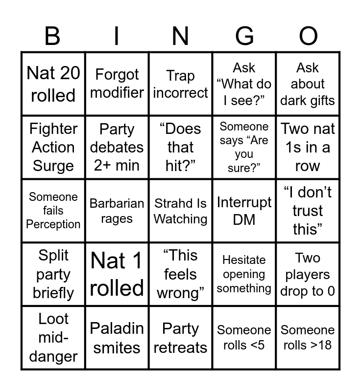 This bingo card has a free space and 24 words: Nat 1 rolled, Paladin smites, “Does that hit?”, Loot mid-danger, Ask about dark gifts, Nat 20 rolled, Fighter Action Surge, Forgot modifier, Interrupt DM, “This feels wrong”, Someone says “Are you sure?”, Someone fails Perception, Hesitate opening something, Two players drop to 0, Party debates 2+ min, Someone rolls <5, “I don’t trust this”, Trap incorrect, Two nat 1s in a row, Barbarian rages, Someone rolls >18, Split party briefly, Ask “What do I see?” and Party retreats.