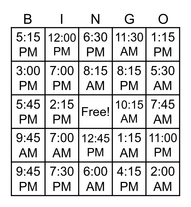 This bingo card has a free space and 52 words: 12:00 AM, 2:00 AM, 4:00 AM, 6:00 AM, 7:00 AM, 9:00 AM, 12:00 PM, 1:00 PM, 3:00 PM, 5:00 PM, 7:00 PM, 9:00 PM, 11:00 PM, 1:15 AM, 3:15 AM, 5:15 AM, 8:15 AM, 10:15 AM, 11:15 AM, 1:15 PM, 2:15 PM, 4:15 PM, 5:15 PM, 8:15 PM, 10:15 PM, 12:30 AM, 2:30 AM, 4:30 AM, 5:30 AM, 7:30 AM, 8:30 AM, 11:30 AM, 12:30 PM, 2:30 PM, 3:30 PM, 6:30 PM, 7:30 PM, 10:30 PM, 1:45 AM, 3:45 AM, 6:45 AM, 7:45 AM, 9:45 AM, 10:45 AM, 12:45 PM, 1:45 PM, 4:45 PM, 5:45 PM, 6:45 PM, 8:45 PM, 9:45 PM and 11:45 PM.