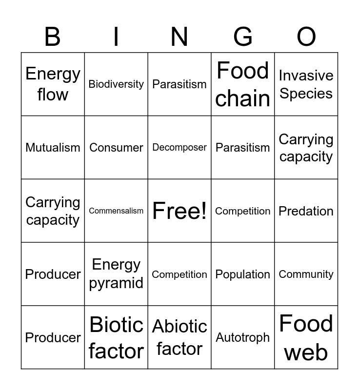 This bingo card has a free space and 45 words: Ecosystem, Biotic factor, Abiotic factor, Population, Community, Producer, Consumer, Decomposer, Food chain, Food web, Energy flow, Energy pyramid, Competition, Predation, Symbiosis, Mutualism, Commensalism, Parasitism, Limiting factor, Carrying capacity, Biodiversity, Habitat, Autotroph, Invasive Species, Ecosystem, Biotic factor, Abiotic factor, Population, Community, Producer, Consumer, Decomposer, Food chain, Food web, Energy flow, Energy pyramid, Competition, Predation, Symbiosis, Mutualism, Commensalism, Parasitism, Limiting factor, Carrying capacity and Biodiversity.