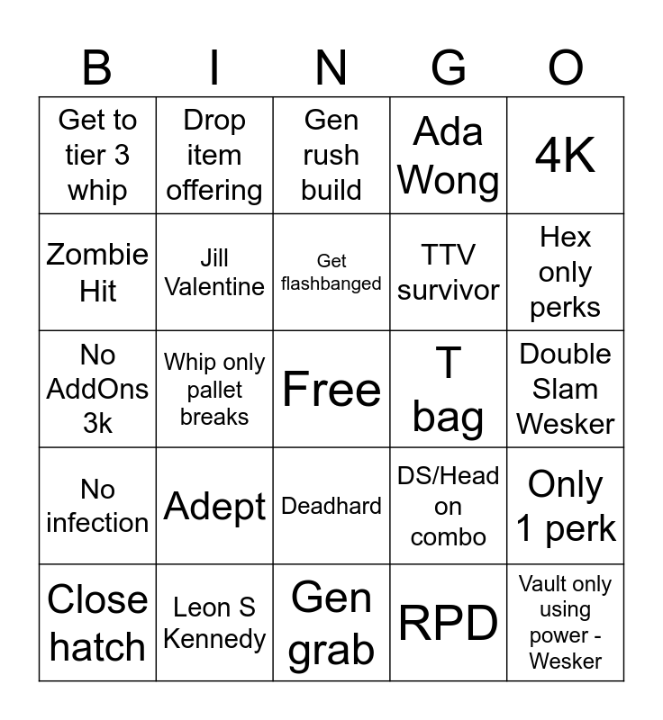 This bingo card has a free space and 24 words: Adept, Leon S Kennedy, Get flashbanged, Close hatch, 4K, Get to tier 3 whip, Zombie Hit, Drop item offering, T bag, Deadhard, TTV survivor, No AddOns 3k, DS/Head on combo, Only 1 perk, Jill Valentine, RPD, Double Slam Wesker, Gen rush build, Hex only perks, Whip only pallet breaks, Vault only using power - Wesker, No infection, Ada Wong and Gen grab.